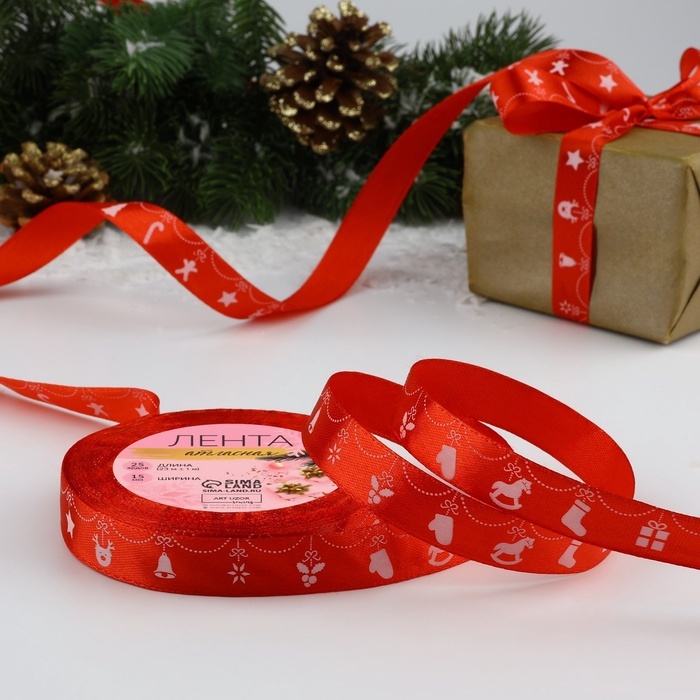 Атласная лента новогодняя, ширина 15 мм, длина 23 метра