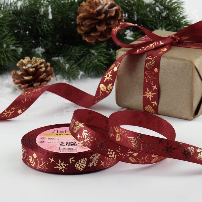 Атласная лента новогодняя, ширина 15 мм, длина 23 метра, цвет бордовый