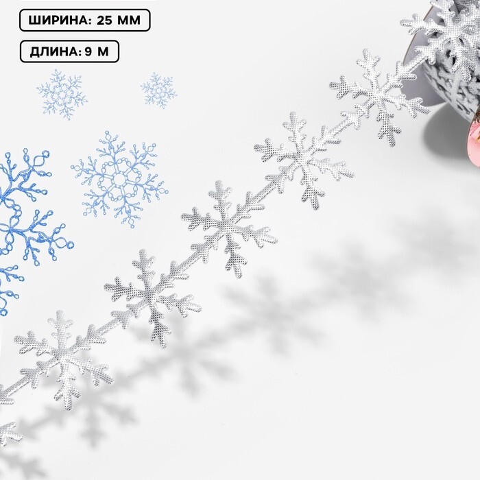 Фигурная лента «Снежинки» станет выразительным элементом зимнего декора. Её серебристый оттенок напоминает свежий иней на стекле и подчёркивает атмосферу зимнего праздника. Такой аксессуар используют для упаковки подарков, украшения ёлок и создания интерьерных композиций. Снежинки на ленте добавляют лёгкости и прозрачности, словно морозный узор на окне.