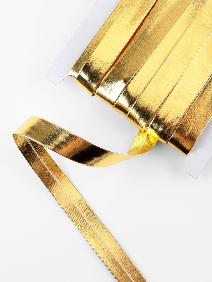Откройте для себя идеальное решение для отделки и декорирования — косую бейку из кожзаменителя золотого цвета! Она станет незаменимым помощником в ваших творческих проектах.