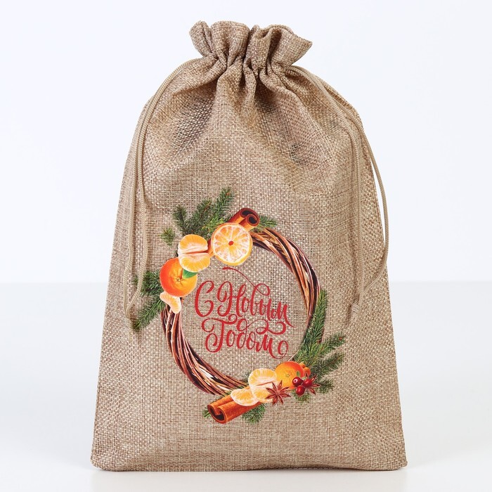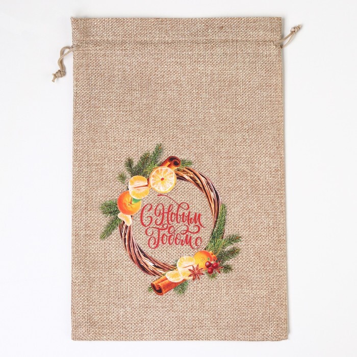 Мешочек подарочный новогодний с термонаклейкой холщовый, размер 20х30 см (в завязанном виде 20х26 см) рисунок только с одно стороны.