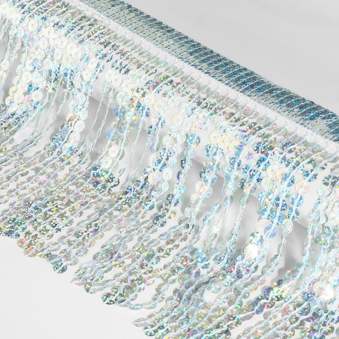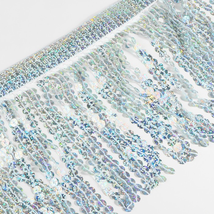 Используйте эту серебристую бахрому с пайетками шириной 160 мм для создания эффектных украшений, отделки одежды или элементов декора. Ее универсальность позволяет реализовать самые разные идеи, придавая изделиям блеск, динамику и стиль благодаря голографическому эффекту и мерцающим пайеткам.